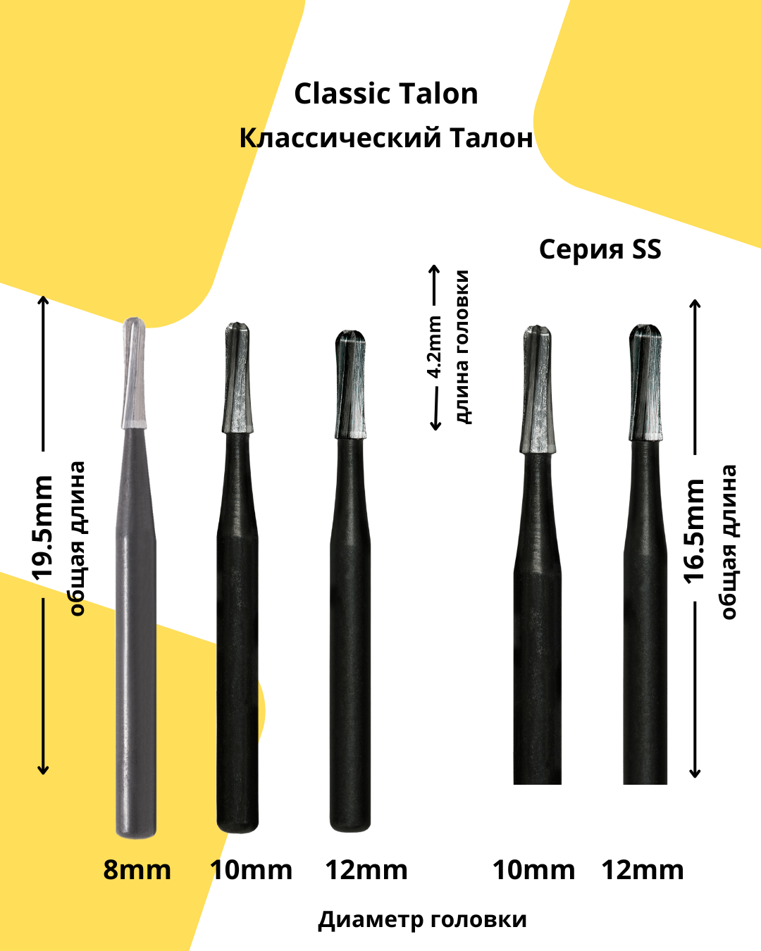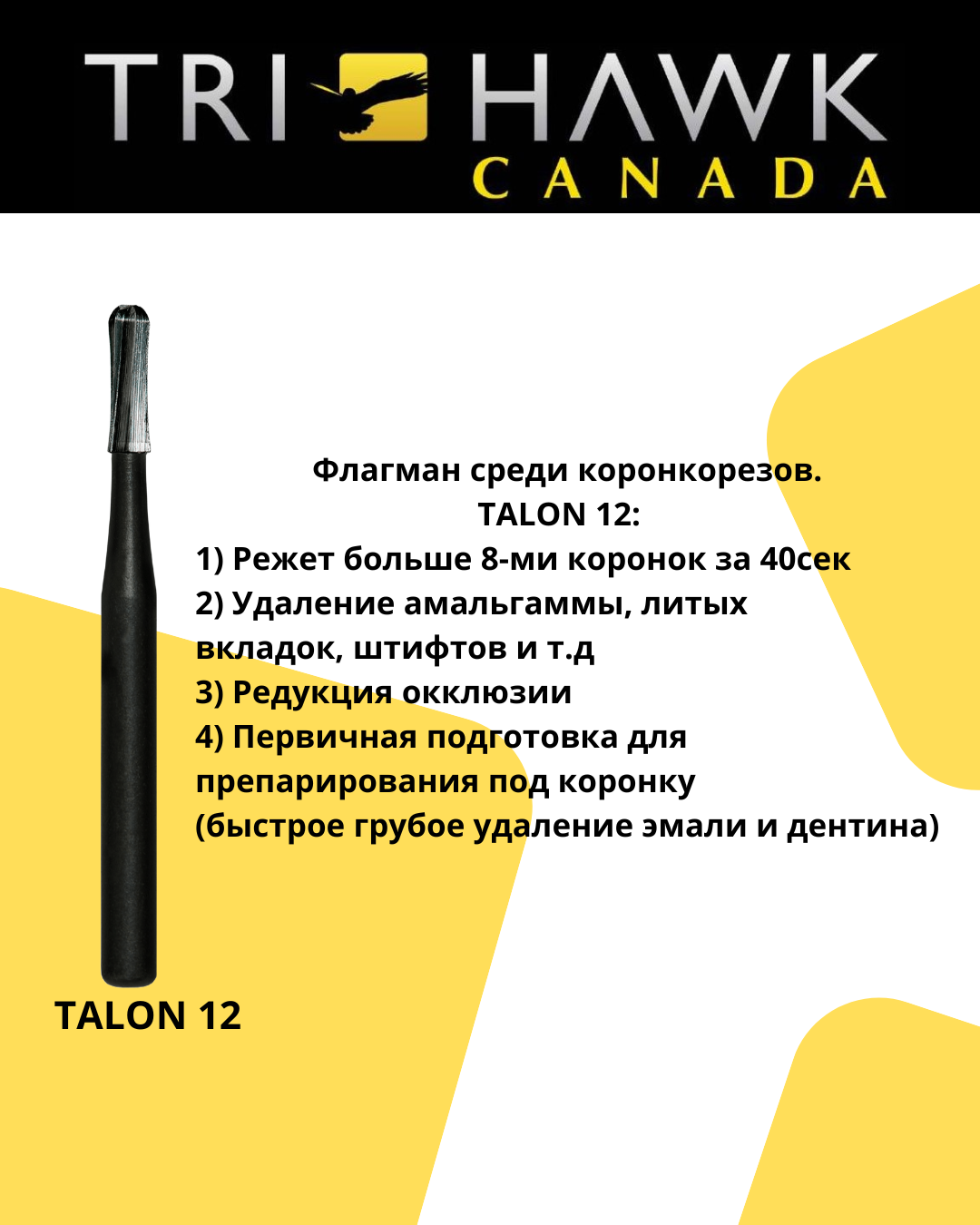 Конструкция Talon в форме песочных часов (гиперболическая) совершенно уникальна на стоматологическом рынке. Вместо того, чтобы сделать бор прямым цилиндром с круглым концом, мы добавили специальный изгиб к форме бора. Этот изгиб увеличивает скорость резки и предотвращает засорение лезвий, что обеспечивает плавность резки и стабильную скорость вращения. Tri Hawk также использует уникальную смесь карбида вольфрама (WiDia), которая позволяет нам делать лезвия более острыми и долговечными, чем у любых других производителей. В серии TALON используются 6 острых центрически расположенных лезвий специальной лазерной заточки (без зазубрин), тогда как все остальные производители предлагают боры с поперечной насечкой (маленькие пилообразные зубья). Боры с поперечной насечкой тупятся быстрее, потому что маленькие зубья часто ломаются, уменьшая площадь поверхности рабочей части и нарушая равновесие, которое ведет к поломке бора.