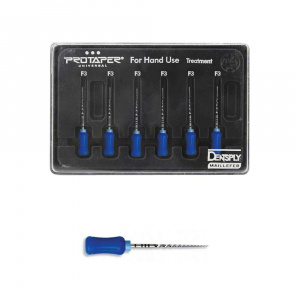 Ручные протейперы ProTaper Universal, длина 25мм, размер F3 (синий), 6 файлов для финишной обработки корневых каналов, нестерильные, многоразовые в пластиковой кассете.