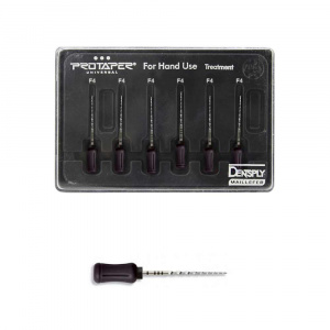Ручные протейперы ProTaper Universal, длина 25мм, размер F4 (чёрный), 6 файлов для финишной обработки очень широких корневых каналов, нестерильные, многоразовые в пластиковой кассете.