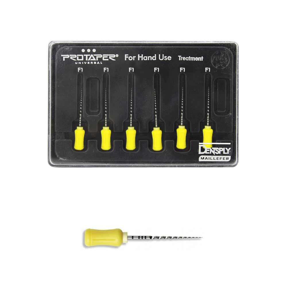 Ручные протейперы ProTaper Universal, длина 31мм, размер F1 (жёлтый), 6 файлов для финишной обработки корневых каналов, нестерильные, многоразовые в пластиковой кассете.